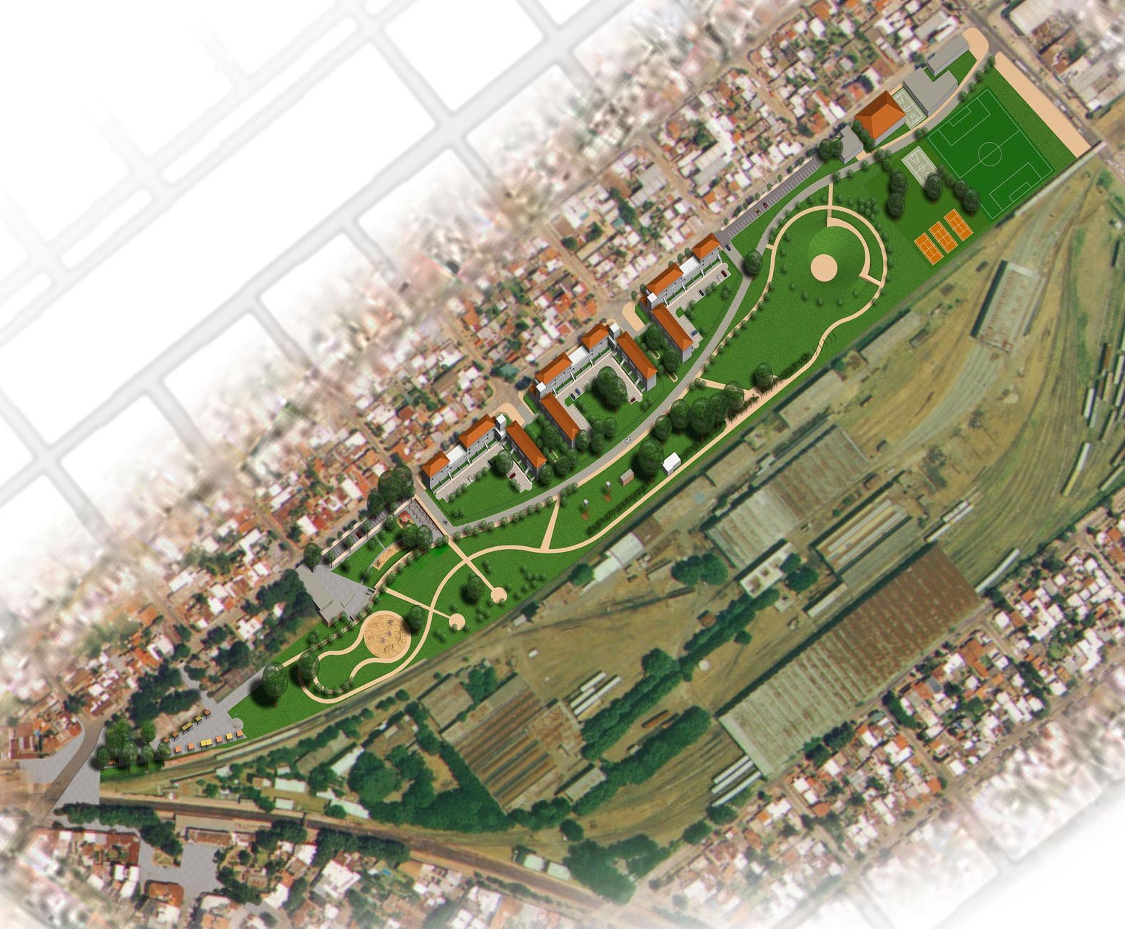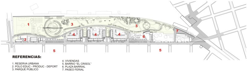 - Configurar el Parque a lo largo de la totalidad del terreno bordeando el ferrocarril, como frontera verde definitiva del Barrio Crisol, visible y accesible desde todas las calles transversales y vinculado por sus extremos con el resto del Partido. El planteo presupone una vocación futura de extender este Parque sobre partes o la totalidad del terreno ferroviario, para conformar en tal circunstancia el área verde pública más significativa del Partido de San Fernando.