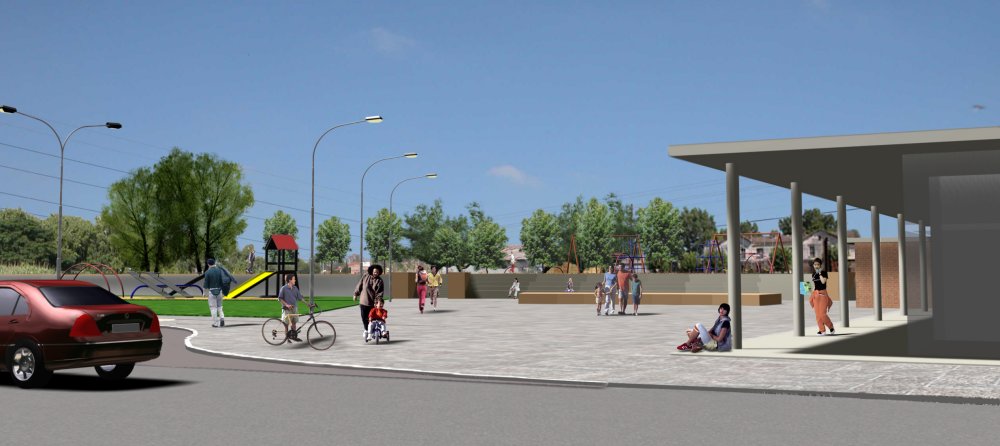 La Plaza se completa con juegos para niños pequeños, un vértice para calesita, un área verde de descanso y, como plano de fondo, un largo muro de 2 m. de altura (1 m. de desnivel y 1 m. de parapeto) que funcionará como plano soporte de exposiciones gráficas, artísticas y carteleras.