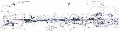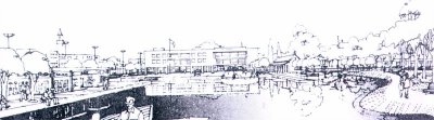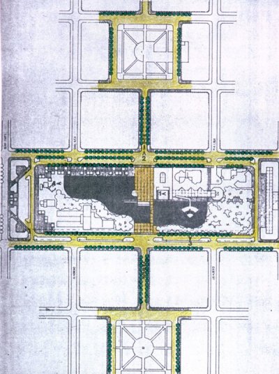 A partir del rediseño de la playa de maniobras del ferrocarril (Ärea cívica, lago, Municipio y otros), se tomó la decisión de determinar con mayor énfasis el área central unificando el solado de las veredas (amarillo), el arbolado (verde), y generando un cruce transversal del área cívica a través de una secuencia de lugares (plaza seca, puente sobre lago y explanada frente a edificio municipal). Se trata así de reforzar la noción de centralidad por el uso de materiales y elementos que se repiten.-