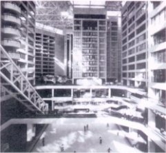 a) El espacio pasante constituye la pauta morfológica de mayor fuerza integradora y también la más difícil de lograr. El espacio urbano atraviesa la masa perforada del edificio y lo entrelaza con la imagen del entorno. Nos estamos refiriendo no a la continuidad ambiental interior-exterior, sino a la perforación de los volúmenes y a la transparencia de la masa construída, para obtener una visión simultánea del edificio con el paisaje urbano